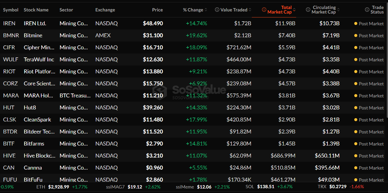 암호화폐 채굴 부문은 낙관론의 물결에 휩쓸려 13.84%의 섹터 상승률을 기록하며 전반적으로 상승세를 보였습니다(데이터 SoSoValue). 비트마인의 주가는 20% 가까이 올랐고, 사이퍼 마이닝은 18% 이상 상승했습니다.